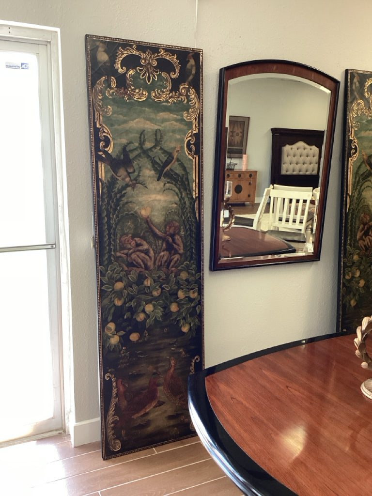 Pair Wall Panels with monkeys and birds, hand painted, crackled coromandel
