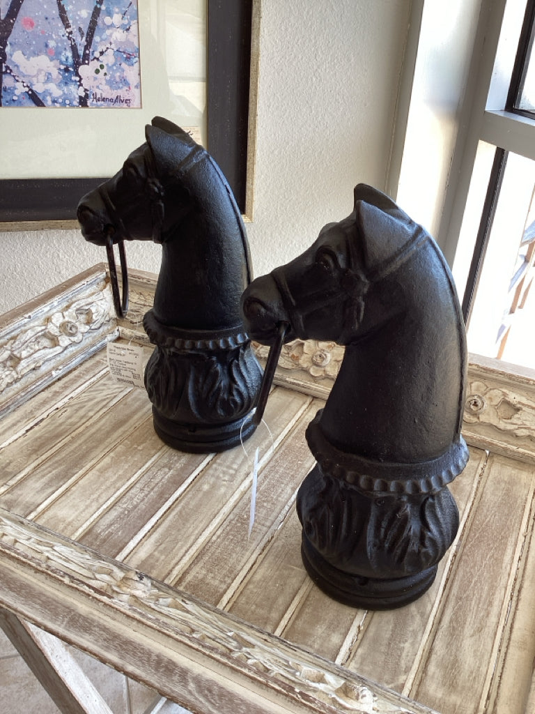 Pair Horse Head hitching post toppers with ring, vintage iron